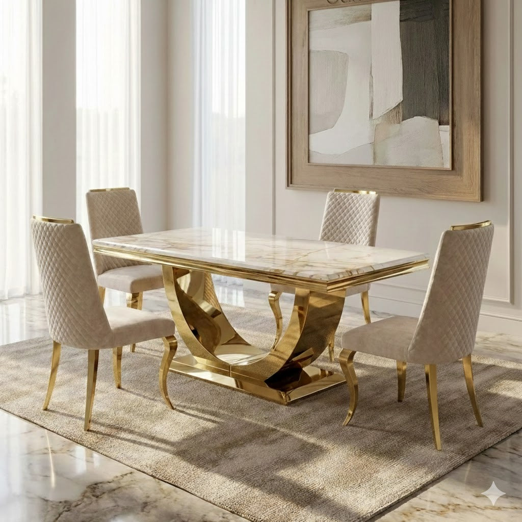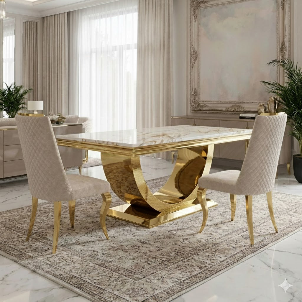 Ultra chic and glamorous, this contemporary dining table redefines high end living. Comprising of a beautiful 2 meter Arial marble dining table which is complemented with polished gold swooping base.