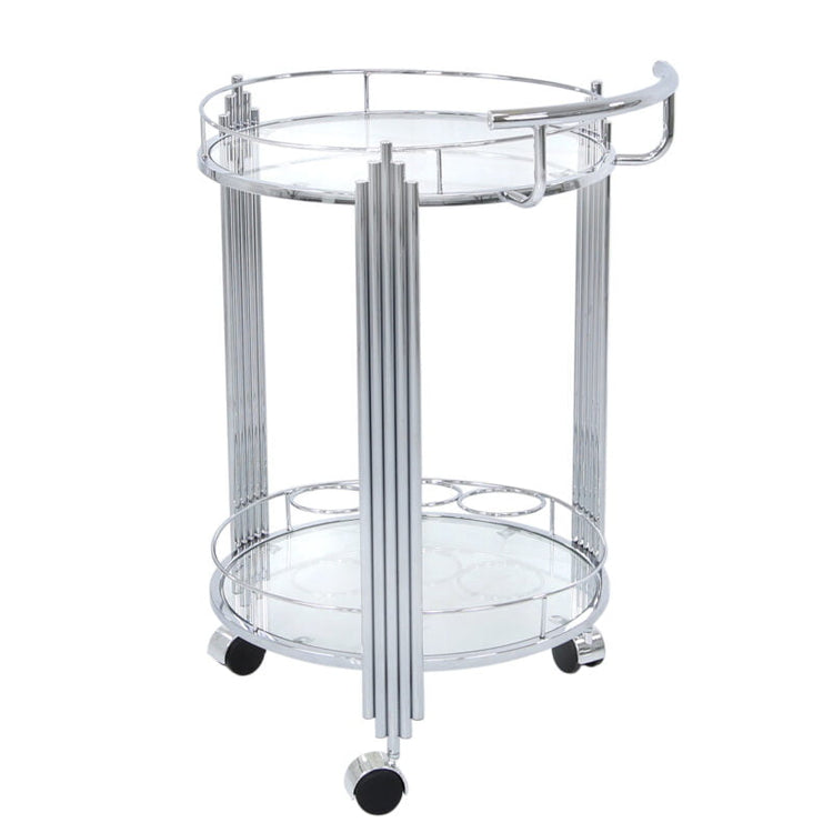 The Cohen drinks trolley is perfect for keeping spirits and glassware close to hand for parties or evenings at home. Featuring a unique, contemporary, circular base with wheels for easy manoeuvring, upper and lower glass storage shelves, polished chrome tubular feature sides and handle.
