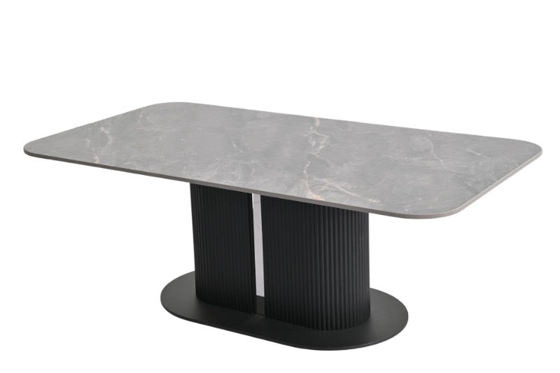 The Sydney range features sleek designs with soft curved edges, embodying contemporary elegance. These pieces are crafted with ceramic sintered stone table tops and finished with an black ribbed base. The grey sintered stone is non-porous, waterproof and resistant to heat and cold, with scratch-resistant, stain-proof and antibacterial qualities, allowing functionality to combine with style.