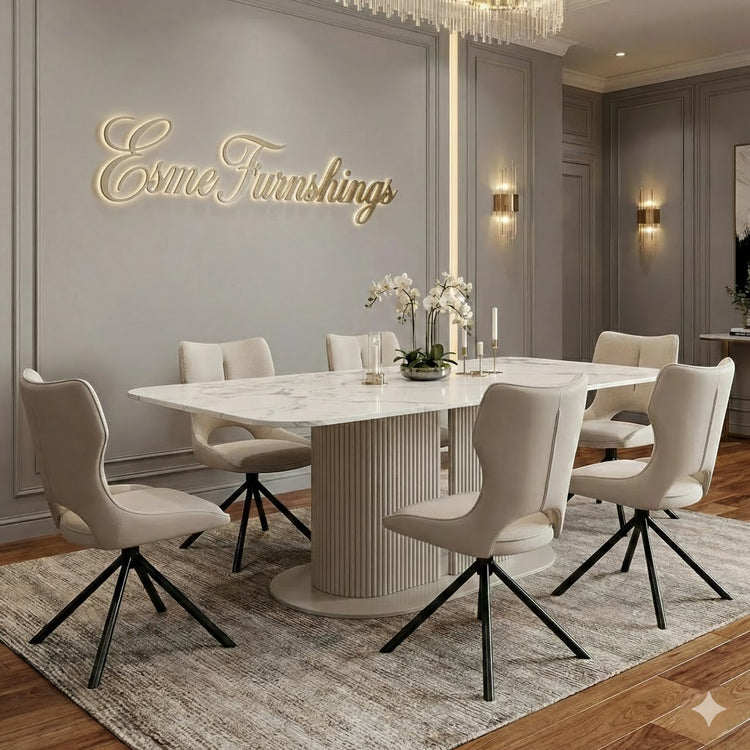 This comes with the popular Sydney dining chairs in a sumptuous beige plush velvet and swivel 360