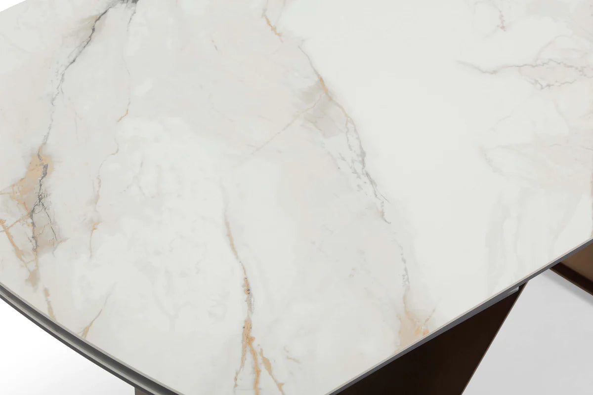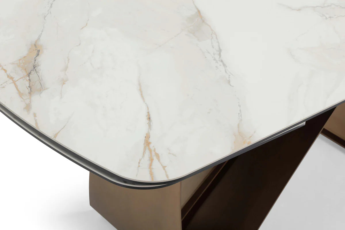 Wear and scratch resistant, stain-proof and easy to clean. The table top edges are rounded, preventing bumps and offering greater safety for family members, especially households with children. It has a matt top with a glass top coating to ensure maximum safety and long lasting. - Base is Metal & Brass