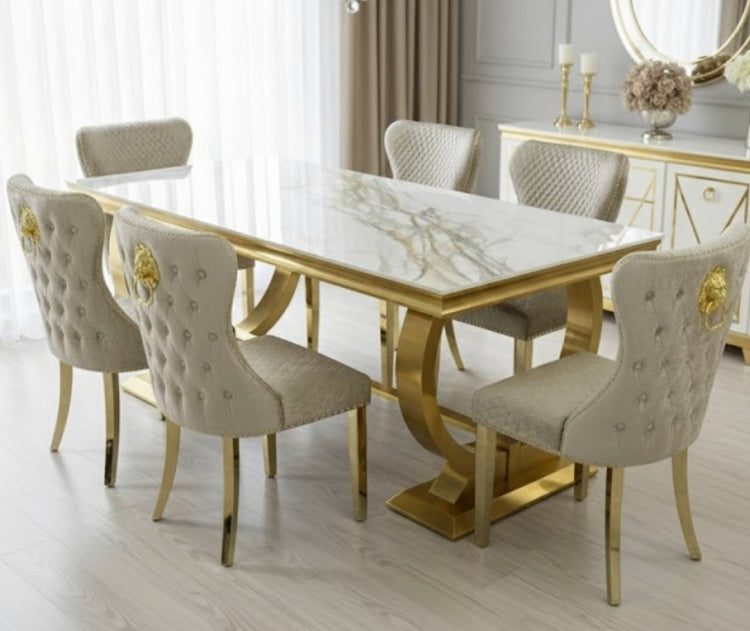 This comes with the popular Valente gold lion knocker dining chairs in a sumptuous plush velvet and come in champagne mink or light grey - You can select your options from the drop down menu bar.