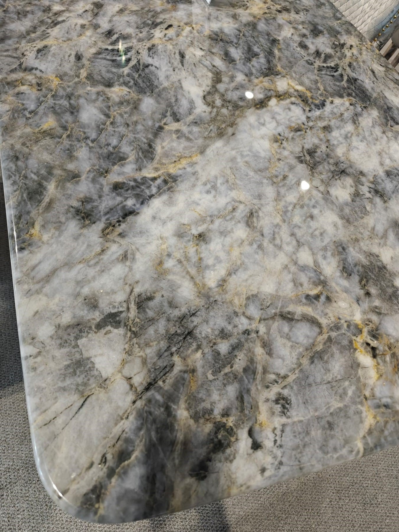 This comes with the new exclusive Milano Gold Frame chairs in either black and gold or cream and gold or grey and gold fabric with gold legs to complement the dining table. This will be a centre piece